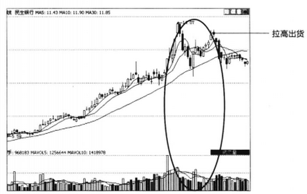 上圖是民生銀行(600016)的日K線圖和成交量,在股價上漲一大段后,主力已拉到目標價位,然后快速拉高出貨。