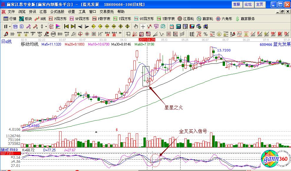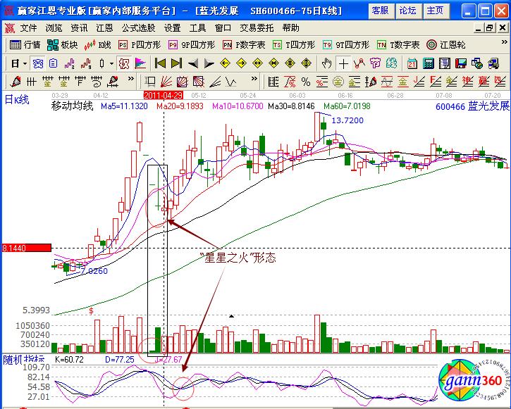 無論是在下跌的走勢行情中還是上漲的走勢變化中,十字星可以說都是變盤的信號,特別是用股票行情軟件在大跌行情中分析的“星星之火”形態(tài),就是意味著股價筑底已經(jīng)完成,是反彈上漲的征兆。接下來我們就通過藍光發(fā)展的實例進行分析。