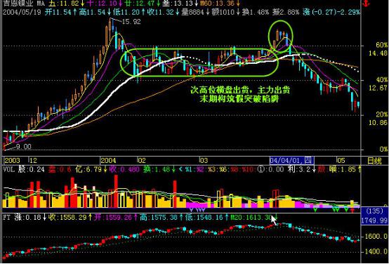 如上圖所示主力在次高位橫盤出貨,在出貨的末期再構(gòu)筑出假突破的陷阱。圖片是假,誘多是真!