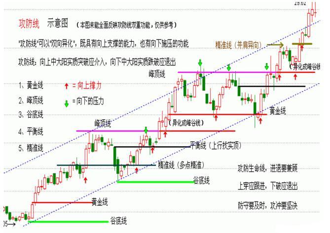 是所有量線的代名詞,但不包含峰谷線,攻防線可攻可守,股價在其上方,下踩線不破可以介入;中大陽線實質(zhì)下破要接機退出;股價在其下方,上觸線不過要退出,中大陽實質(zhì)上穿要積極介入;
