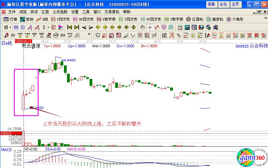 99年6月11日上市的眾合科技(000925)亦為一頭瘋牛,上市當(dāng)日陽(yáng)線實(shí)體接近6元,換手超過(guò)70%,第二天高開高走,短線跟進(jìn)亦有40%左右的利潤(rùn),大連金牛(0961)上市時(shí)走勢(shì)亦與此類似,撲捉瘋??梢园盐找幌聨讉€(gè)要點(diǎn):