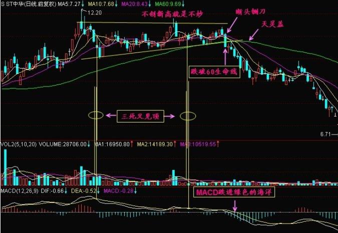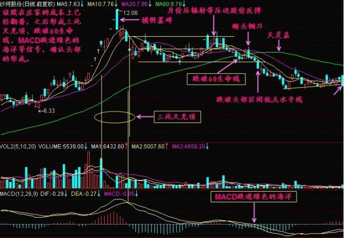 這里說一下,需要注意的地方,在一只股票上漲幅度很大之后,特別是股價在莊家的成本上已經翻倍之后,從客觀來講莊家已經有了派發(fā)的條件和理由,所以,如果在高位出現寬幅震蕩,并且反復出現“三死叉見頂”信號,此時的股價已經不能夠再創(chuàng)新高,換句話說就是創(chuàng)新高的難度大大增加,那么在這種情況下,一旦出現“跌破60生命線”、“MACD線跌進綠色海洋”等頭部信號,證明頭部成立,投資者應立即果斷做決定,不能猶豫。
