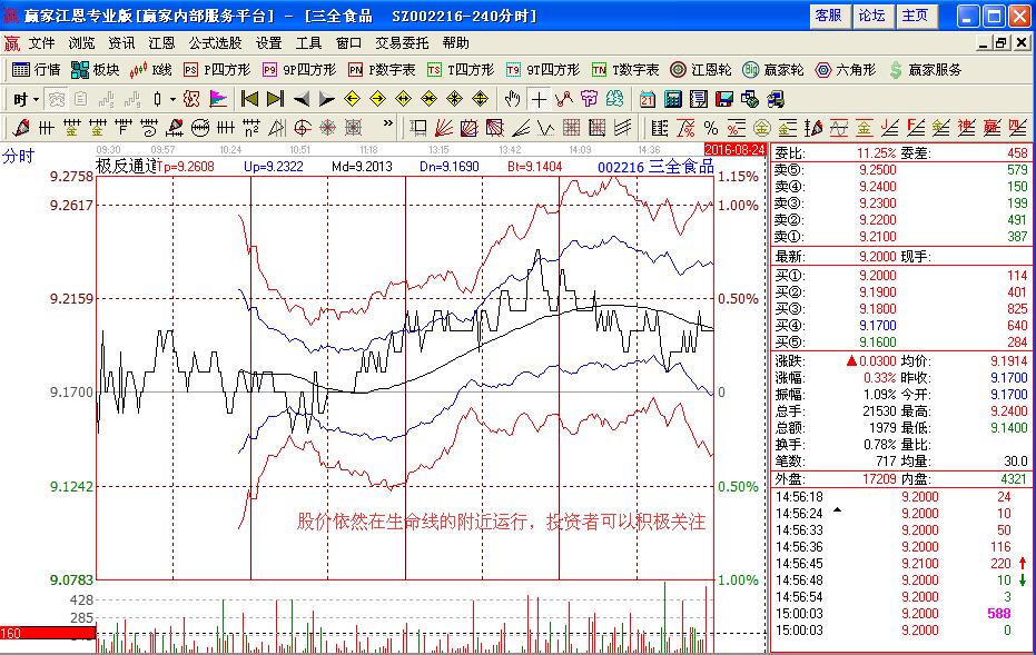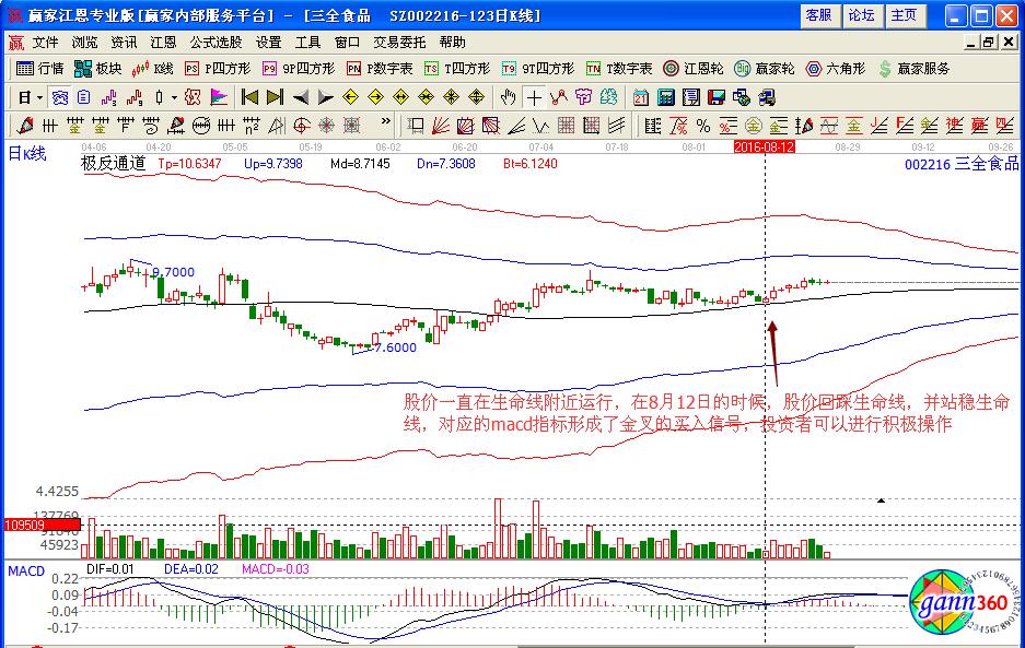 那么在了解了基本的消費(fèi)類(lèi)股票之后,投資者應(yīng)該怎樣分析消費(fèi)類(lèi)股票呢,我們可以通過(guò)三全食品(002216)的個(gè)股走勢(shì)進(jìn)行分析,如圖該股在2016年8月份在極反通道生命線附近的走勢(shì),股價(jià)在8月12日的時(shí)候,回踩生命線,是在強(qiáng)勢(shì)區(qū)域中運(yùn)行,而且對(duì)應(yīng)的macd指標(biāo)給出的是金叉買(mǎi)入的操作信號(hào),投資者可以大膽的進(jìn)行買(mǎi)入操作,同時(shí)注意其上方藍(lán)色上軌線是股價(jià)上漲的壓力位置,在不突破壓力出現(xiàn)下跌回調(diào)的時(shí)候,可以考慮賣(mài)出操作。