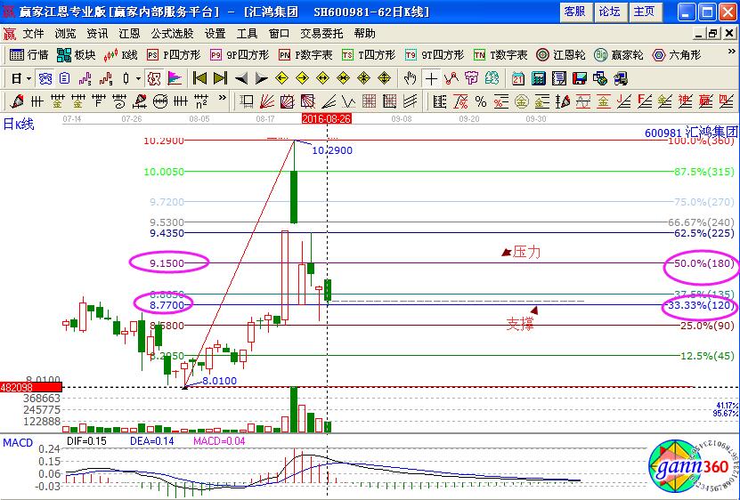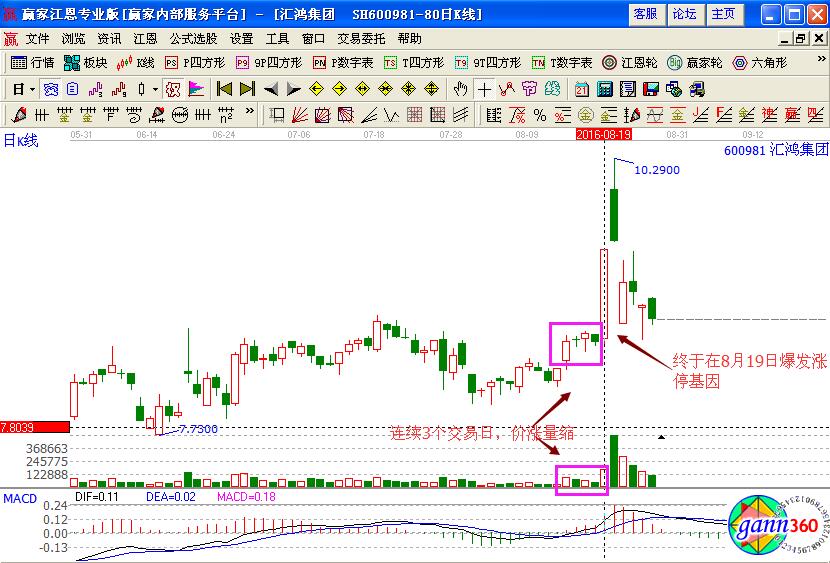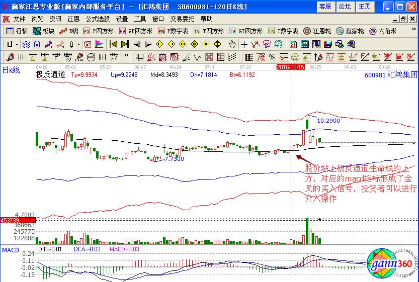 如圖匯鴻集團(600981)在極反通道中的走勢形態(tài),在2016年8月份的時候,股價一直處于生命線的附近運行,類似與橫盤整理的形態(tài)(股票橫盤是什么意思),之后繼續(xù)觀察其股價的走勢變化,可以看出在8月15日的時候,股價站上了生命線的上方,進入強勢區(qū)域運行,而且對應(yīng)的macd指標形成的是金叉買入的操作信號,投資者可以在該位置進行買入操作,等待后市的上漲形態(tài)。