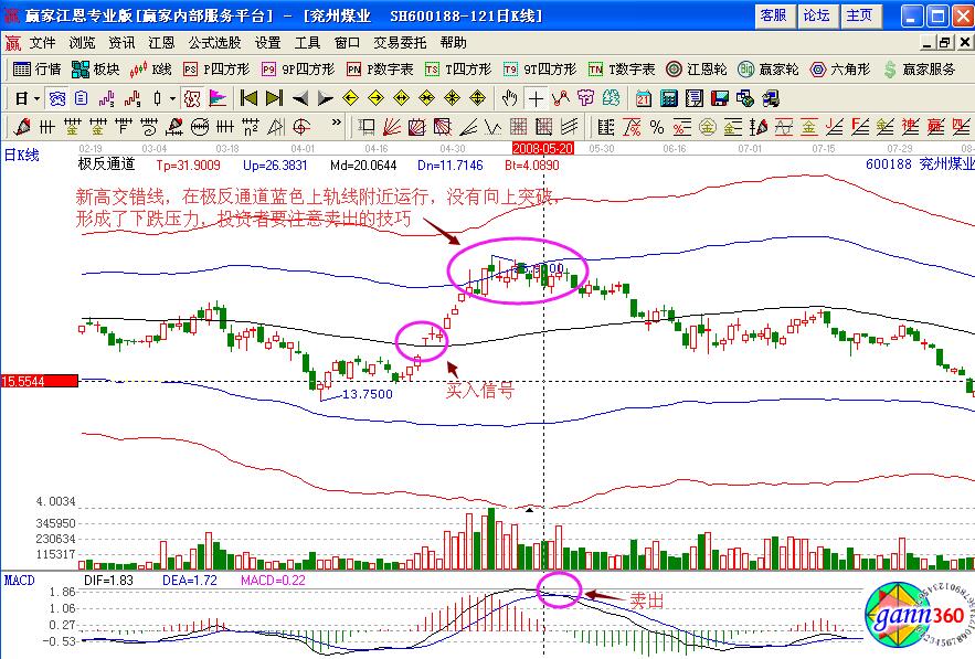 在贏家江恩軟件中使用極反通道進(jìn)行觀察,發(fā)現(xiàn)在股價(jià)向上跳空漲停的時(shí)候,處于極反通道生命線的上方強(qiáng)勢運(yùn)行,是一個(gè)穩(wěn)健的買入點(diǎn)位置,之后股價(jià)向上拉升,形成了新高交錯(cuò)線,在強(qiáng)勢區(qū)域藍(lán)色上軌線的附近運(yùn)行,但是并沒有直接向上突破壓力,反而是在5月20日的時(shí)候跌破了藍(lán)色上軌線,投資者應(yīng)該及時(shí)的尋找合適的賣出點(diǎn),再加上macd指標(biāo)給出的死叉賣出信號(hào),更加確定的賣出規(guī)避風(fēng)險(xiǎn)的操作策略。