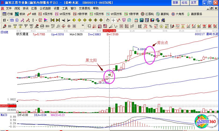 其次在極反通道中的走勢變化,在出現(xiàn)黑太陽K線走勢特征的時候,股價處于生命線的上方運行,是走勢中的一個穩(wěn)健介入點位置,投資者在介入之后,需要注意上漲走勢的壓力位置,在股價向上沒有突破紅色外軌線的時候,要及時的考慮賣出的操作,以規(guī)避后市中的下跌損失!