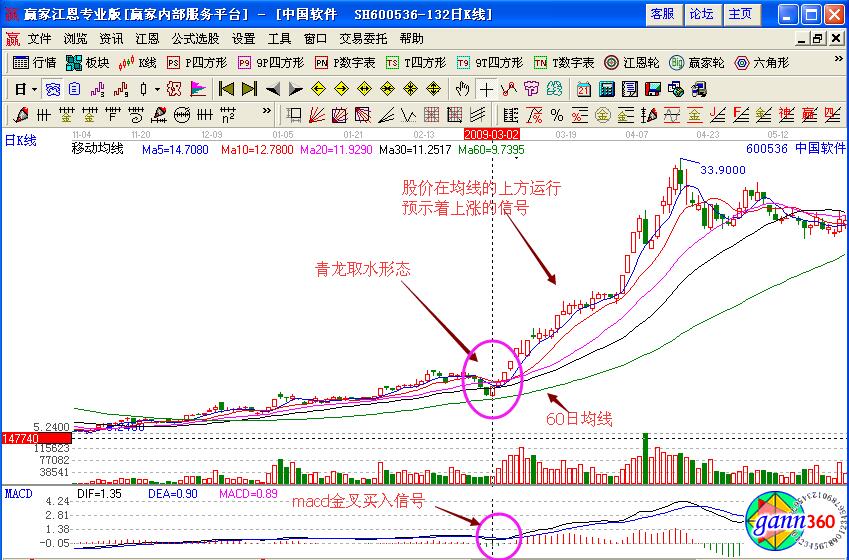 如圖中國軟件(600536)在2009年3月2日的時候,股價前期一直處于下跌徘徊的走勢,并形成了青龍取水的形態(tài),也就是牛股龍形,之后股價在60日均線的附近位置下跌之后,繼續(xù)反彈上漲,并沒有跌破60日均線,之后股價在均線的上方運行,均線形成多頭排列的形態(tài),是一個強烈的上漲信號,投資者可以在該點位置進(jìn)行買入操作。