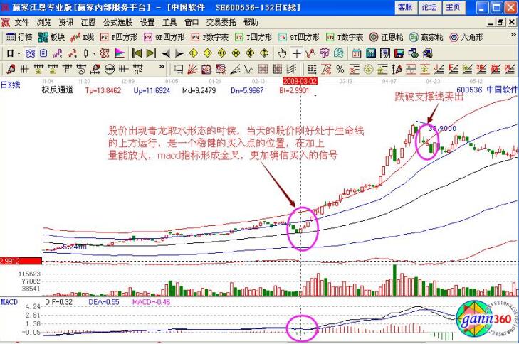 同時對比在極反通道中的走勢形態(tài),股價在3月2日的時候剛好處于生命線的上方,是強勢運行的信號,而且量能微微縮小,macd指標(biāo)形成金叉走勢,之后的量能逐漸的放大,是一個穩(wěn)健的買入點,之后股價向上突破了藍(lán)色上軌線,并突破紅色外軌線運行,在股價跌破紅色外軌線的時候,投資者要考慮賣出的操作。