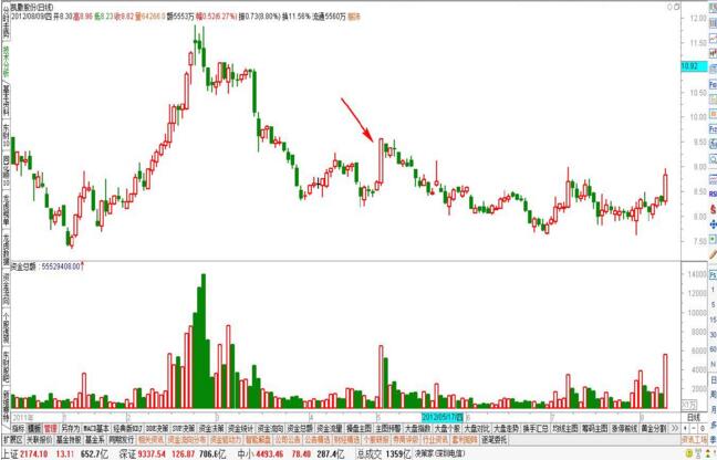 如圖該股在2012年8月9日的股價(jià)走勢(shì),是從高位向下下跌的K線走勢(shì),但是在下跌的過(guò)程中突然出現(xiàn)了一根向上拉升的大陽(yáng)線,之后股價(jià)再次繼續(xù)下跌,說(shuō)明主力沒(méi)有充分的蓄勢(shì),并不是真正的愿意做多,有巨量換手的嫌疑,投資者要注意下跌中的風(fēng)險(xiǎn),不要盲目的追入,該形態(tài)是明顯的下跌中繼大陽(yáng)線,是短暫的反彈,反彈結(jié)束依然會(huì)繼續(xù)下跌,投資者要注意操作風(fēng)險(xiǎn)。