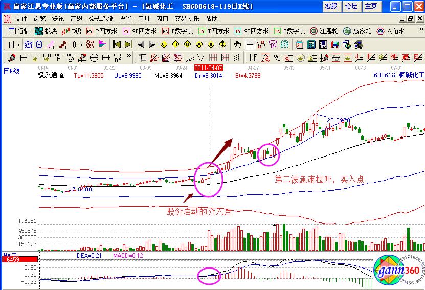 氯堿化工出現(xiàn)連續(xù)拉升的三陽(yáng)線(xiàn)是一個(gè)比較特殊的案例,首先我們來(lái)分析前期的個(gè)股走勢(shì),如圖在2011年4月2日的時(shí)候,股價(jià)拉升上漲突破了極反通道藍(lán)色上軌線(xiàn),并且量能放大,macd指標(biāo)形成了金叉買(mǎi)入的操作信號(hào),是一個(gè)不錯(cuò)的追漲介入點(diǎn),在介入之后觀(guān)察后期走勢(shì),股價(jià)連續(xù)拉升突破了紅色外軌線(xiàn),在高檔區(qū)緩慢拉升三大陽(yáng)線(xiàn),但是上漲乏力出現(xiàn)了短暫的回調(diào)走勢(shì),股價(jià)回踩藍(lán)色上軌線(xiàn)。