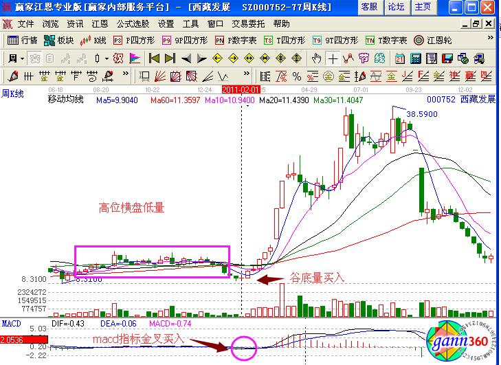 西藏發(fā)展(000752)在2011年初的股價(jià)走勢(shì),前期經(jīng)歷了一波高位橫盤(pán)的地量走勢(shì),是一個(gè)賣(mài)出的信號(hào),如果沒(méi)有賣(mài)出,可以繼續(xù)觀察后期的走勢(shì),在2月1日的時(shí)候形成了谷底地量的形態(tài),對(duì)應(yīng)的成交量是低量,并且形成的是十字星的變盤(pán)信號(hào),macd指標(biāo)形成的是金叉買(mǎi)入的信號(hào),投資者可以積極的進(jìn)行買(mǎi)入操作。