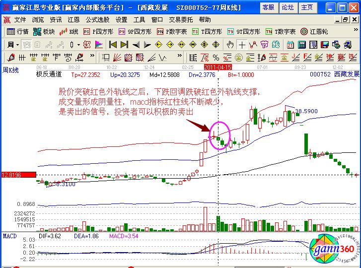 在投資者介入之后,必然要了解賣(mài)出獲利的點(diǎn)的,同樣是在極反通道中,該股向上連續(xù)拉升了多個(gè)交易日,以漲停大陽(yáng)線突破藍(lán)色上軌線,紅色外軌線,在高位橫盤(pán)兩天,第三天形成了下跌陰線跌破紅色外軌線,是一個(gè)下跌賣(mài)出的信號(hào),同時(shí)對(duì)比macd指標(biāo)的走勢(shì),其紅柱線不斷的減少預(yù)示著短期下跌的信號(hào),可以積極的選擇賣(mài)出獲利。