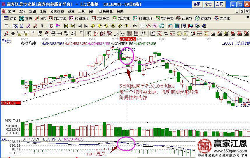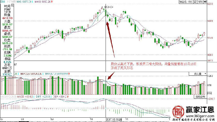 如圖上證指數(shù)在2007年10月份的走勢(shì)變化,指數(shù)經(jīng)過(guò)上漲拉升到達(dá)6124.04的高點(diǎn)之后,開(kāi)始下跌回落,此時(shí)5日均線下穿10日均線形成了高位的一個(gè)死叉,是賣出的信號(hào),說(shuō)明前期的走勢(shì)已經(jīng)形成了一個(gè)階段的高點(diǎn);
