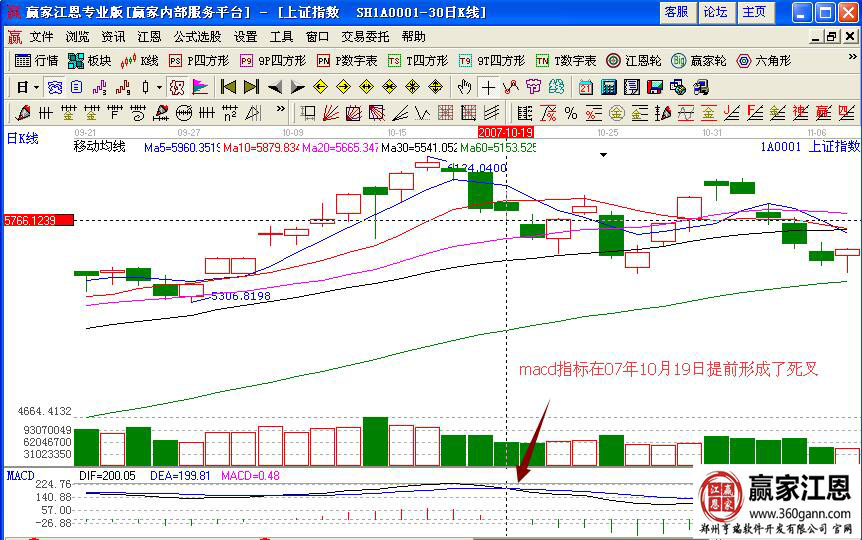 重要的是macd指標(biāo)買賣點(diǎn)的確認(rèn)情況,分析上漲指數(shù)在2007年10月19日的走勢(shì)變化,指數(shù)在下跌的第三天,均線拐頭向下,macd指標(biāo)形成了死叉的賣出信號(hào),這個(gè)時(shí)候投資者應(yīng)該已經(jīng)是選擇賣出了。這個(gè)時(shí)候發(fā)現(xiàn),均線死叉、均量線死叉、macd指標(biāo)死叉是連續(xù)的出現(xiàn),說(shuō)明前期的走勢(shì)形成的是一個(gè)短期的頭部形態(tài),希望投資者把握其中的盈利機(jī)會(huì)。