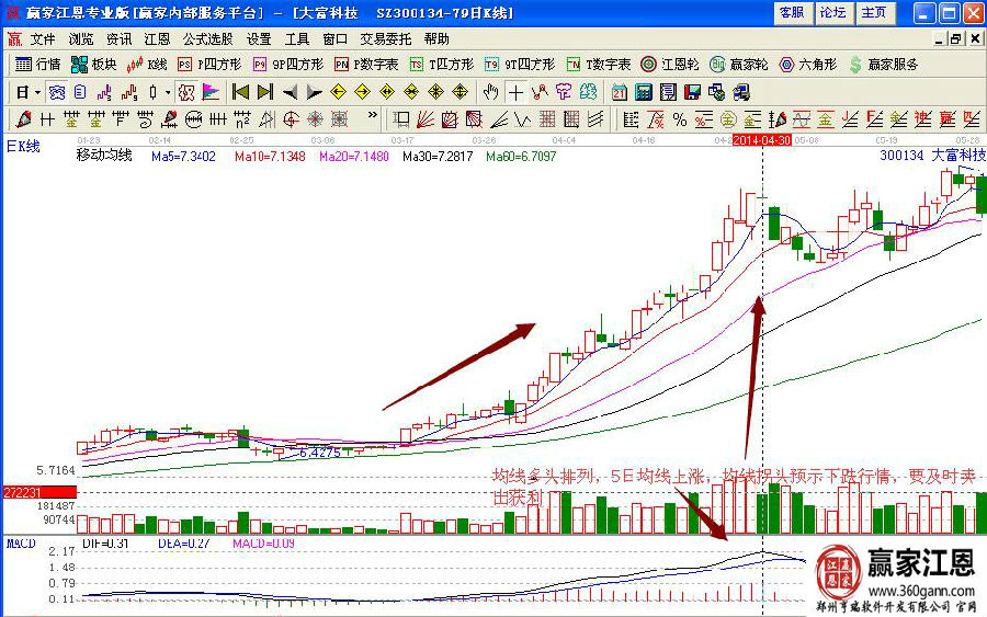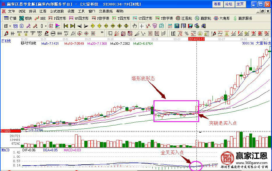 如圖大富科技(300134)在2013年底到2014年初的股價走勢形態(tài),在均線的簡單走勢配合中,前期的股價走勢是一直在低位橫盤整理的蓄勢形態(tài),雖然有緩慢的拉升,但是上漲的幅度不是很大,之后股價在14年3月份的時候形成了塔形底的形態(tài),在3月17日形成一根大陽線向上突破,對應(yīng)的成交量明顯的放大,說明有資金入場,macd指標(biāo)形成金叉買入的操作信號,均線多頭排列預(yù)示著上漲的操作行情,投資者可以積極的介入。