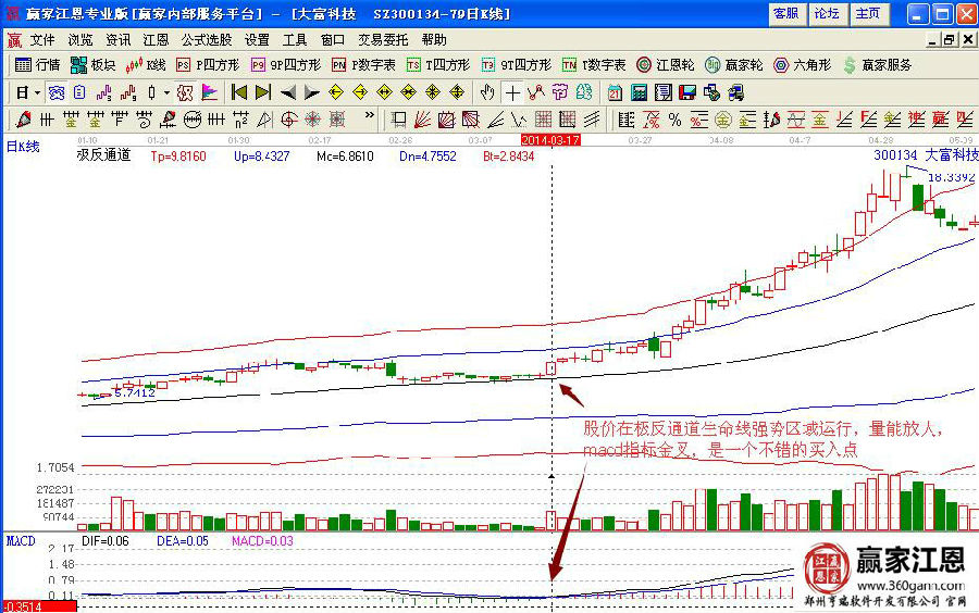 如果投資者不放心買點的位置,可以通過贏家江恩的極反通道進行研判,如圖在14年3月17日的時候,股價以漲停陽線站穩(wěn)生命線并向上拉升,在強勢區(qū)域中運行,量能不斷的放大,macd指標(biāo)金叉,是一個不錯的買入點位置。