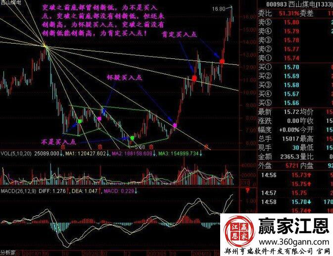 所以投資者可以依據(jù)扇骨線的走勢(shì)形態(tài)研判大盤的走勢(shì),以及個(gè)股的買賣點(diǎn)位置,圖中顯示的位置就說明了有三個(gè)買點(diǎn):肯定買入點(diǎn)、懷疑買入點(diǎn)以及不是買入點(diǎn)的位置。