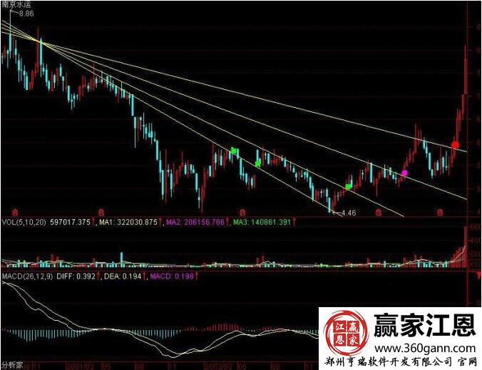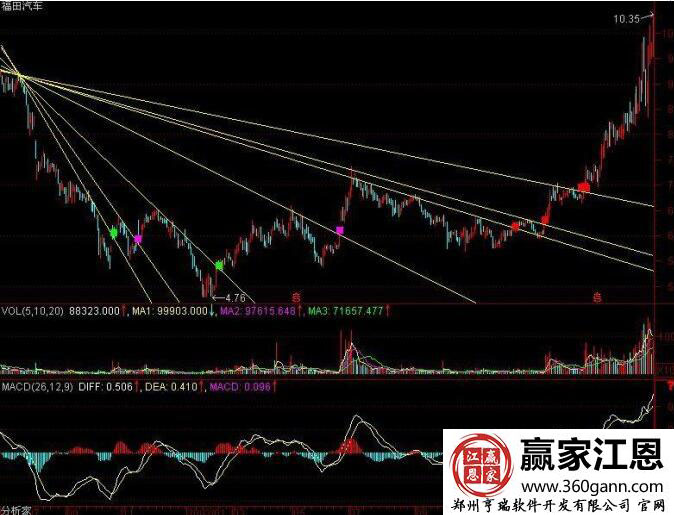 如圖該股的走勢(shì)形態(tài)形成了一個(gè)階段性的最高點(diǎn),而且在之后的突破點(diǎn)中,都沒有突破新高,從其畫圖的走勢(shì)中,能夠看出,扇骨線具有三個(gè)基本特征:伺從性,指的是K線會(huì)依據(jù)扇骨的走勢(shì)進(jìn)行運(yùn)行;支撐向,股價(jià)一旦沖過扇骨線以后,再回落的話,一般壓不到前面的扇骨線;突破性,只有突破才有行情,沖不過去就沒有行情;