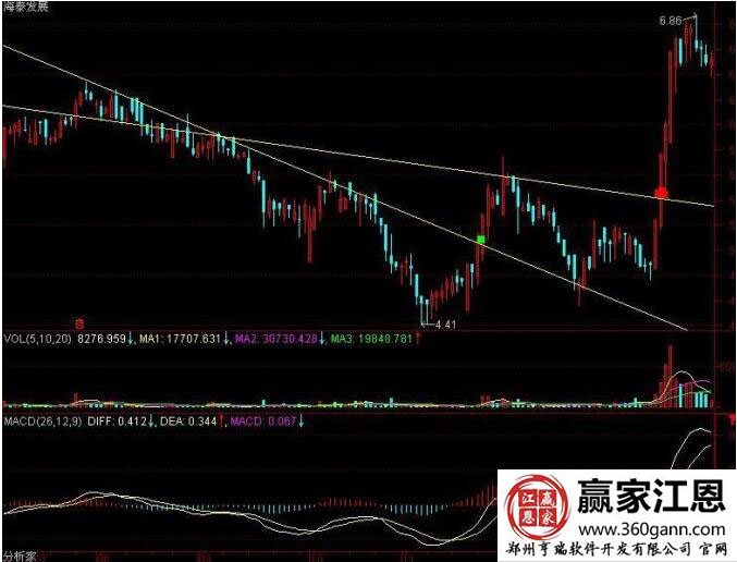 如圖海泰發(fā)展中的紅色點(diǎn)標(biāo)注位置,就是其中的肯定買入點(diǎn);