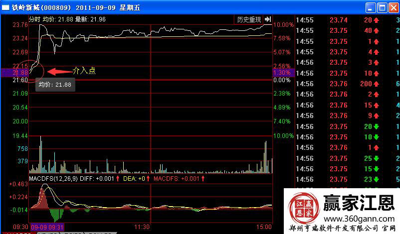 想要買入就需要選擇合適的買入點(diǎn)位置,分析該股在2011年9月9日的分時(shí)圖走勢(shì)形態(tài),從中能發(fā)現(xiàn),該股開盤之后就向上拉升,第一個(gè)介入點(diǎn)的位置是開盤集合競(jìng)價(jià)的階段,之后股價(jià)在拉升過程中,出現(xiàn)了向下回落的走勢(shì),投資者可以下分時(shí)線回踩均價(jià)線的位置進(jìn)行買入操作,之后股價(jià)一直在均價(jià)線上方運(yùn)行,最終拉升漲停板。