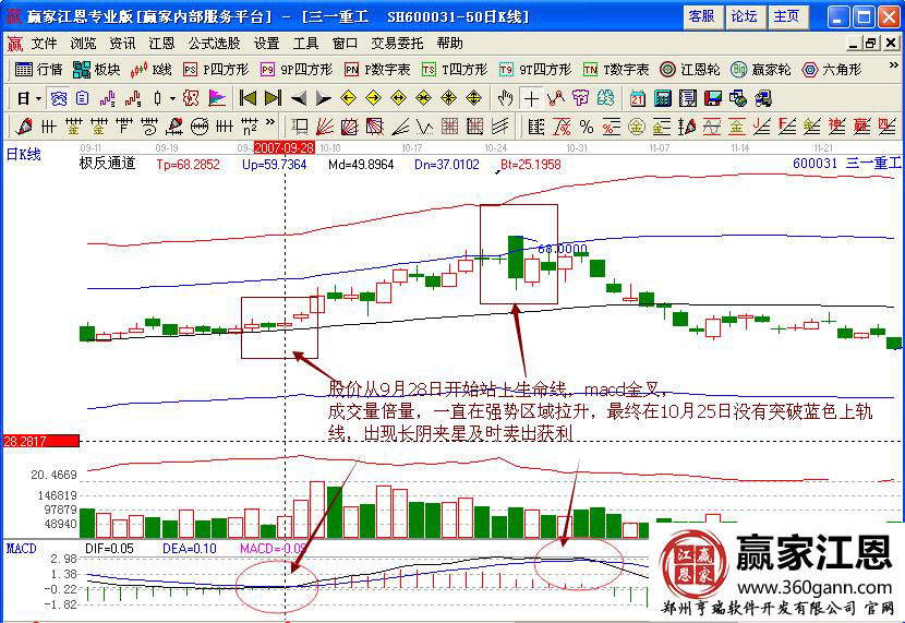 其實仔細(xì)分析該股的走勢可以發(fā)現(xiàn)在極反通道中,該股從9月28日站上生命線,同時macd指標(biāo)形成金叉,成交量倍量柱,是介入的操作信號,之后股價一直在生命線上方的強(qiáng)勢區(qū)域運行,最終在10月25日沒有向上突破藍(lán)色上軌線的壓力,出現(xiàn)了長陰夾星的走勢,預(yù)示著下跌的走勢行情,投資者可以及時的賣出獲利,以規(guī)避下跌中的資金損失。