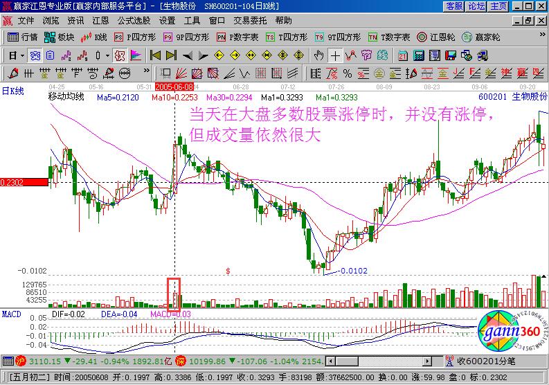 在2005年6月8日大盤漲勢(shì)猛烈,上證指數(shù)漲幅是8.2%,大盤中有很多漲停個(gè)股,有些個(gè)股雖然沒(méi)有漲停,但成交量也很大,生物股份(600201)就是其中一個(gè)。該股當(dāng)天成交317萬(wàn)股,成交量已經(jīng)相當(dāng)高,感覺(jué)就像是隨大盤上漲帶來(lái)大量追漲盤,但提醒大家需要注意的是:當(dāng)日間斷性交易。