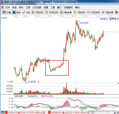 二、在k線形態(tài)上,k線的實體較小,通常有多根連續(xù)性的小陰小陽線,且其間?,F(xiàn)十字星走勢;
