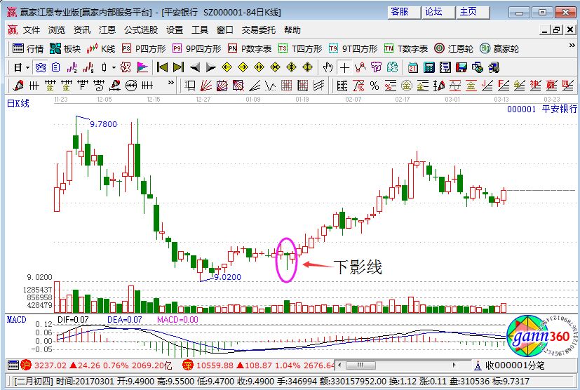了解下影線測(cè)市法,首先要先了解什么是下影線。在k線圖中,下影線指的是從實(shí)體向下延伸的細(xì)線,如下面平安銀行走勢(shì)圖中所表示的K線。