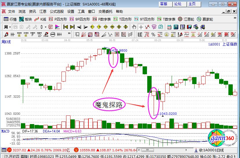 依據(jù)以上論述推測(cè):這條下影線出現(xiàn)在大盤(pán)的高位,兩市的慢牛行情已持續(xù)了大半年,總體升幅已達(dá)50%以上。根據(jù)走勢(shì)看,前半周大盤(pán)先以小陽(yáng)攀升已收復(fù)了大部分失地,無(wú)疑此下影線短期上對(duì)大盤(pán)產(chǎn)生一定的止跌作用。但下半周市場(chǎng)又開(kāi)始展開(kāi)調(diào)整,并侵吞了去年8月23日下影線的大半部分。因此技術(shù)上顯示不排除主力先誘多然后出逃的可能。加之周K線收陰,故而上上周的下影線屬于“魔鬼探路”的可能性就很大了。