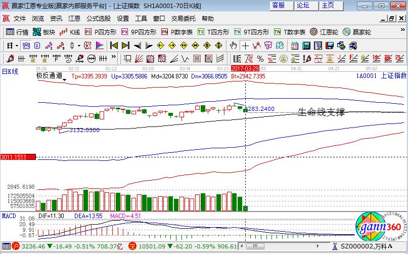 買入:個股達(dá)到了預(yù)期的支撐價位,做好買入準(zhǔn)備。但要進(jìn)一步保證買入的成功率,需結(jié)合具體的盤面走勢。若大盤當(dāng)日無大礙(上漲或震蕩),縮量跌到支撐位,盤口穩(wěn)健且日內(nèi)量、價、指標(biāo)等出現(xiàn)底背信號,則直接掛單買入;反之,若大盤走弱,放量跌破預(yù)期價位,則不要急于買入,耐心等待市場給出穩(wěn)健的買入信號再行動。如現(xiàn)在上證指數(shù)在極反通道指標(biāo)的生命線位置就是支撐位,如果跌破那么就要進(jìn)入到弱勢了。