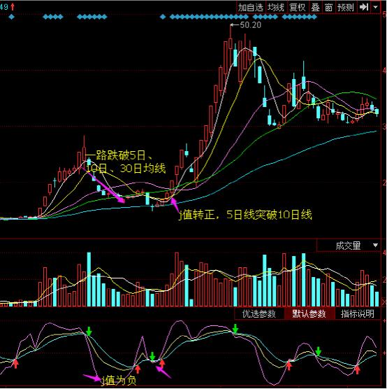 下面我仍以上面的圖形的個股為例,介紹如何利用KDJ的J值判斷階段性頭部的問題。當(dāng)股價(jià)到達(dá)50位置之后,j值到達(dá)了在創(chuàng)新高后到達(dá)了階段性的頂部位置。雖然這個判斷不一定是完全頂部,但是到達(dá)這位置已經(jīng)是距離頂部不遠(yuǎn)了,我們做好出局的準(zhǔn)備。