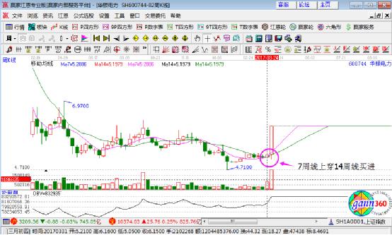 1、 均線運(yùn)行:K線圖上,當(dāng)7周均線上穿14周均線時(shí),堅(jiān)決買進(jìn)(如下圖);反之,當(dāng)7周均線下穿14周均線時(shí),就果斷賣出。