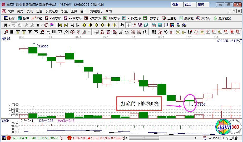 2、打底的K線一定要有下影線,因?yàn)橄掠熬€表示探底后獲得支撐,為反彈的必要條件,如下圖。