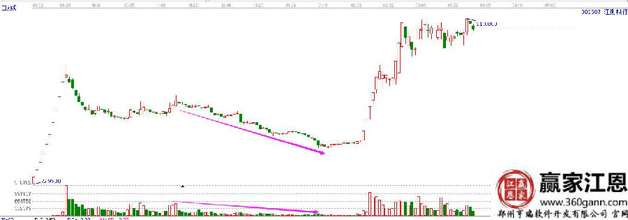 有一些個股在連續(xù)的下跌過程中,成交量也隨之連續(xù)的縮小,這樣的過程其實就是場內(nèi)已經(jīng)沒有多少交易者參與了,要不就是深套不想動,要不就是看著不想買。而這種時候,當(dāng)成交量縮小到一定程度,價格下跌至一定程度,就會看到慢慢的有成交量釋放出來,這其實就是一個信號,有人開始悄悄的建倉了,股價也會因為成交量的放大出現(xiàn)微微的拉升,一旦出現(xiàn)大的成交量就是,個股的拉升也是很快速的,像這樣的低位放量是可以參與的。
