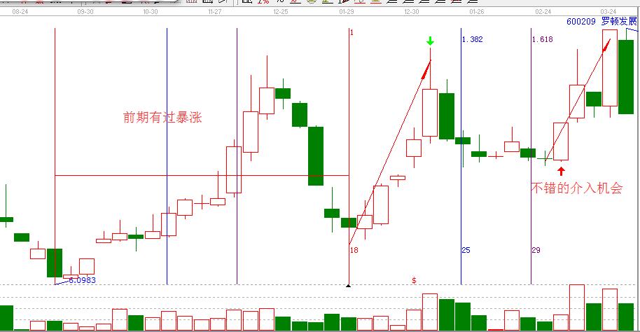 每個階段都有一些活躍的個股,這表明這些股票的主力是活的,他們對于市場的反應(yīng)比那些已經(jīng)不看盤的主力快速而猛烈。同時在前一階段爆發(fā)過比較大題材的個股值得重點關(guān)注。在技術(shù)上,結(jié)合時間周期,可以做他的第二波,如下面羅頓發(fā)展走勢圖。