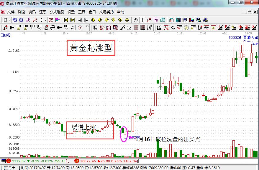 西藏天路就是在一帶一路、水泥板塊和黃金板塊的混合概念,主力資金介入比較深,本年度1月16日,黃金起漲模型提示主力資金介入,并提示買點(diǎn),其后該股便走了幾個波段的漲幅。