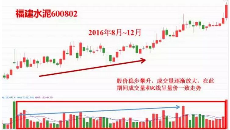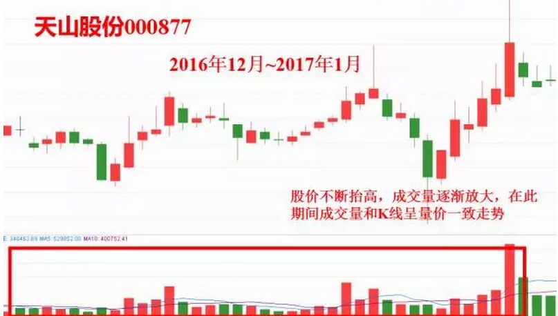 圖上是天山股份在2016年12月到今年1月的日K線走勢,在期間股價不斷太高,成交量逐漸放大,K線和成交量呈現(xiàn)出量價一致的走勢,即股價上漲成交量放大,股價下跌成交量縮小。