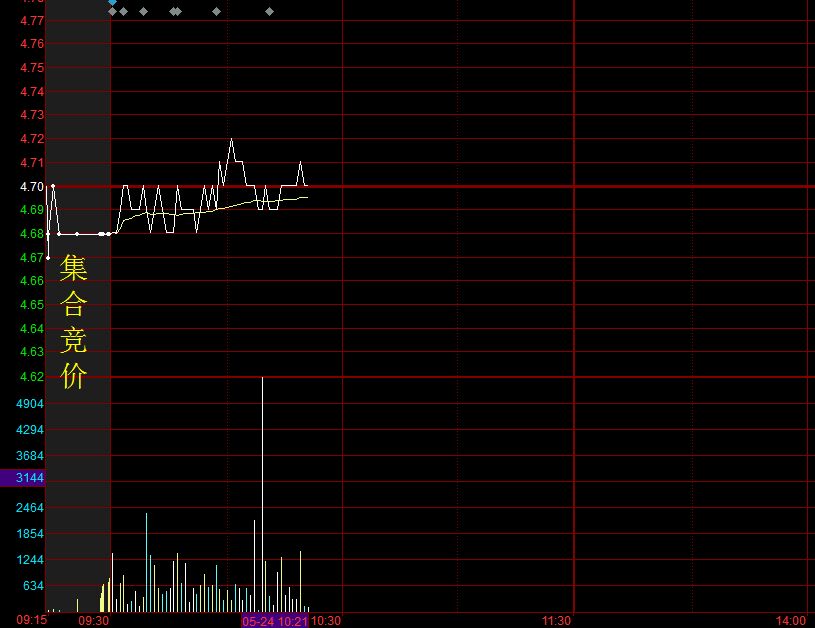 在這5分鐘內(nèi),同樣可以委托買進(jìn)或是賣出單子,但不能撤單了,所以在這個(gè)時(shí)間點(diǎn)的成交量還是比較真實(shí)的,如果是想要搶漲停板,就一定要看準(zhǔn)這5分鐘。而如果不確定買賣的話,就一定不能倉(cāng)促的在這個(gè)位置掛單。下圖就是運(yùn)用股票軟件所截取的分時(shí)走勢(shì)其中前面灰色顏色部分就是集合競(jìng)價(jià)。