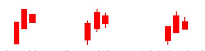 上面的這三種組合圖形都是陽線跛腳形,我們看到這些組合圖形的三根K線都是有陽線所組成的,前面兩根K線都是低開,而后面兩根則是由身懷六甲組合所形成,而且最后一根K線收盤價(jià)已經(jīng)是不在繼續(xù)走高了。