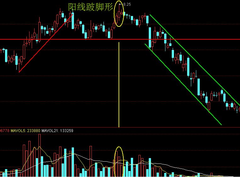 所以陽線跛腳形K線夬就表示著股票的上升趨勢受到阻礙,是屬于滯漲信號(hào),后市向淡的意味比較濃。我們需要注意的是,如若陽線跛腳形組合在股票股價(jià)剛剛啟動(dòng)上攻趨勢的初期出現(xiàn),只是短期上漲的停頓,并且不會(huì)大跌,只有出現(xiàn)在股價(jià)已經(jīng)大幅上漲的高位,才可能引發(fā)大跌。接下來我們來看一張圖形。