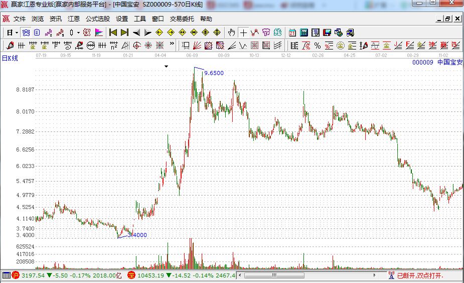 主力坐莊的完整過程通常是“吸、拉、派、落”,但受傷莊股的運動軌跡只有“吸、拉、落”,而少了一個“派”,就是說主力經(jīng)過了吸籌和拉抬,沒來得及派發(fā)股價就回落了,這種情形令主力相當(dāng)難過——這就是受傷莊股。接下來我們就來看一只受傷莊股。