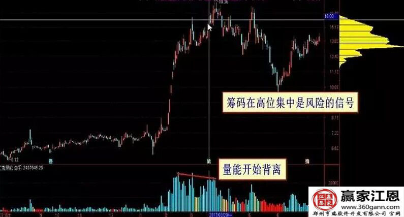 量能放大也就意味著換手放大,也就將進入到下一個過程,就是高位集中,高位集中我說了,不代表一定會跌,在高位由于一只股票已經(jīng)充分的活躍起來,它會形成一只短線股,每天上下波動10幾個點,很多的短線客就非常喜歡在高位玩這些股票,玩的好了,一個禮拜賺10個點8個點不困難,但是不是所有的散戶都具備這樣的能力的。所以籌碼在高位集中是風險的信號。