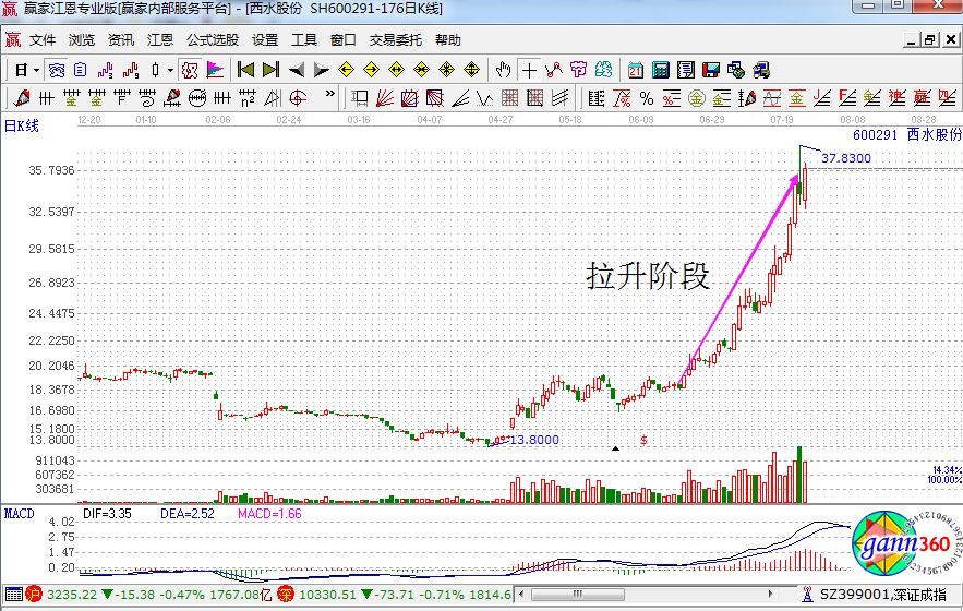 我們知道莊家在拉升的階段,成交量一般會呈現(xiàn)大幅的放大,當(dāng)然這也就是平常我們所說的量價(jià)齊升,呈現(xiàn)的是逐步遞增的走勢,能量上是逐步得到了聚焦,所以相對來說市場是活躍的。當(dāng)然在日K線上的表現(xiàn),那么就是股價(jià)節(jié)節(jié)拔高,走勢好像是破土的竹子。如下面的西水股份就處在拉升的階段之中。