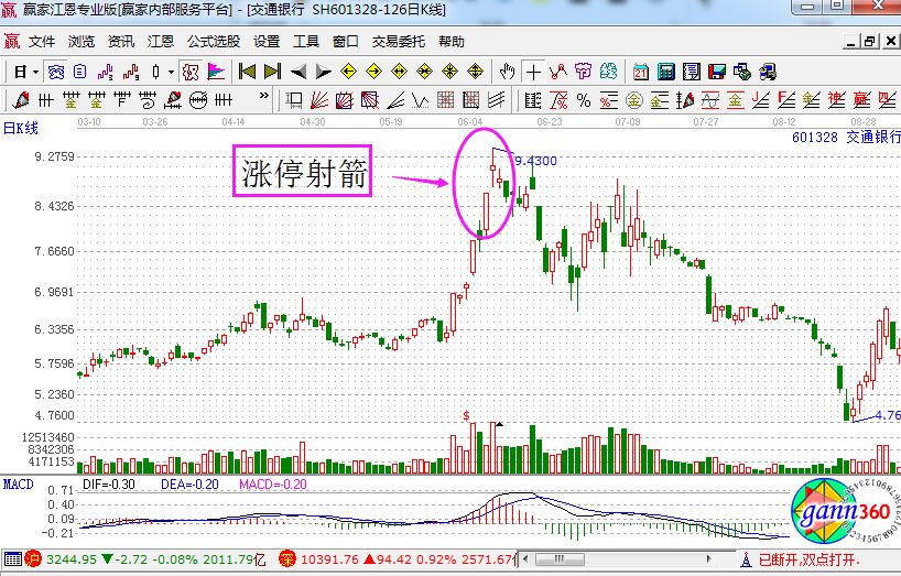 漲停射箭是什么?它指的就是高位漲停之后,莊家進(jìn)行出貨手法。具體的介紹就是,股價在經(jīng)過一段時間的上升,創(chuàng)出階段新高,拉出漲停板之后,第二天的走勢是沖高回落,而且連帶著收出的是帶長上影線的小陽線或者是小陰線,同時成交量是大幅的放大,如下面的交通銀行走勢圖。