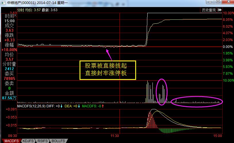 中糧地產(chǎn)在2014年7月14日的分時圖中,無盤之后,市場就傳出了這只股有重組的預(yù)期,隨后,該股就出現(xiàn)了旱地拔蔥的直線封板走勢,而且在封上漲停板之后,個股直接封牢,在沒有進(jìn)行開盤。