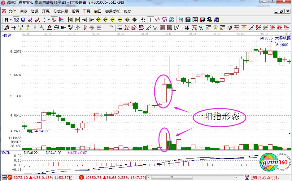什么是K線形態(tài)?它其實指的就是一根平底的大陽線,當然它的自身的條件就是巨幅低開。因為這樣的大陽線之后,一般都會伴隨著非常不錯的機會。如果是在相對低位出現一陽指并且來量能也是巨放且連續(xù)量能比較強的話,那么在一陽指成形的時候或者次日逢低進行建倉,這是個對于抓連續(xù)大陽勝算是比較大的。具體大家可以參考下圖中的一陽指來進行辨別。