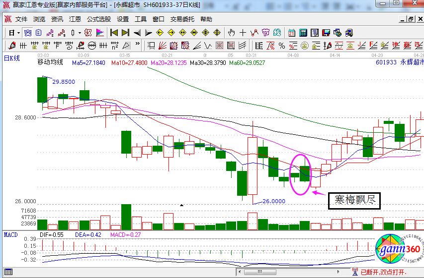 上圖是永輝超市在2011年4月份的日K線走勢(shì)圖,該股從階段性的高點(diǎn)29.85的價(jià)格開始進(jìn)行一路下跌,而且在這期間還出現(xiàn)了跳空下跌,但是在4月份11日的時(shí)候就走出了寒梅飄盡形態(tài),最后一根K線將墻面的兩根陰線全部吞沒(méi),顯然是階段性的底部反攻形態(tài),同時(shí)對(duì)于的macd指標(biāo)形成了金叉,顯然是一個(gè)買入信號(hào),所以此時(shí)投資者只需要觀察次日的走勢(shì),如果是出現(xiàn)在低開的陽(yáng)線走勢(shì),那么就可以大膽的介入了,這樣就可以等后市的操作從而進(jìn)行獲利。