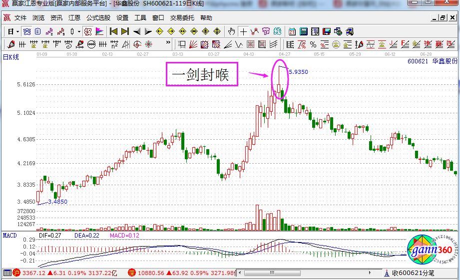 股票一劍封喉戰(zhàn)法是什么?它其實指的就是股票在經(jīng)過了一段時間的上漲以后,在相對的高位或者絕對高位的某一天,股價忽然放量拉升,分時圖呈現(xiàn)加速上揚的走勢,但是股價隨后沖高回落,出現(xiàn)了放量滯漲的K線形態(tài),單日K線上九留下了一個很長的上影線,而且上影線的長度是實體的兩倍甚至更多,這根帶有很長上影線的K線就是一劍封喉,如下圖所示。