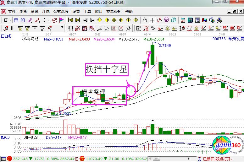 當(dāng)換擋陰十字星出現(xiàn)在橫盤整理區(qū)域的上方時,通常是被許多人誤解為頂部已經(jīng)來臨而不敢介入,但是隨著次日一根陽線將十字星實體完全包住,股價展開了另一輪的升勢,在均價線系統(tǒng)支持股價上漲的情況下,如換擋陰十字星出現(xiàn),投資者應(yīng)該大膽介入。