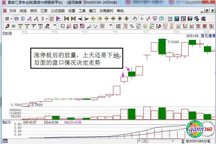 蓮花味精在2009年11月19日走勢中,當(dāng)太難換手率為22%,比之前明顯的放大,漲停收盤,第二日沖高會回落,但是并沒有低收,其后3個漲停,天量第二日繼續(xù)放量,在其后雖然是有三個漲停,但是也制約了股價繼續(xù)飛天。